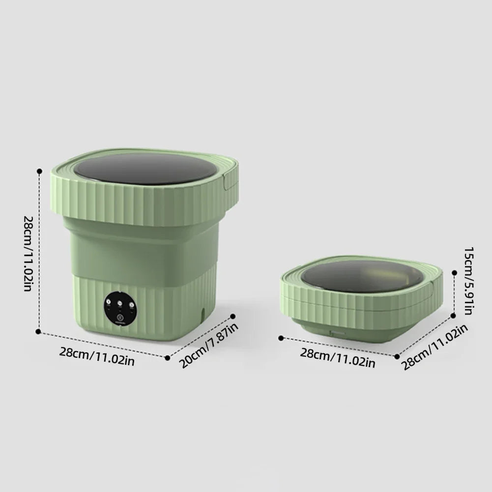 Feature: 1. 2-in-1 Washing and Drying: This portable washing machine offers the convenience of both washing and drying in one unit, saving you time and effort. It effectively separates residual moisture from your clothes, ensuring gentle and efficient cleaning. 2. Three-Speed Modes: With its intelligent three-speed modes, this washing machine meets your different needs. You can choose the appropriate time duration based on the degree of cleanliness required for your clothes. 3. Gentle Cleaning: Designed to mimic hand washing, this machine provides a 360Β° gentle washing action that effectively cleans your clothes without causing damage. It combines powerful stain removal with gentle spinning, leaving your garments clean and intact without the need for manual scrubbing. 4. Foldable Design: The foldable design of this washing machine allows for easy storage in your living room, balcony, or utility room. Simply fold it up with a single press, making it compact and convenient to carry when traveling or moving. 5. Powerful Cleaning Performance: With its 12W powerful washing power and 6L large capacity, this machine can handle your daily laundry needs. It's perfect for washing personal items, eliminating the need for clothing piles. Specification: Material: Environmentally friendly ABS, electronic components Washing capacity: 6L Rated power: 12W Color: green, purple, pink (optional) US, EU, UK (optional) Product size: 28 * 28 * 20cm/11.02 * 11.02 * 7.8inch Folding height: 15cm/5.9inch